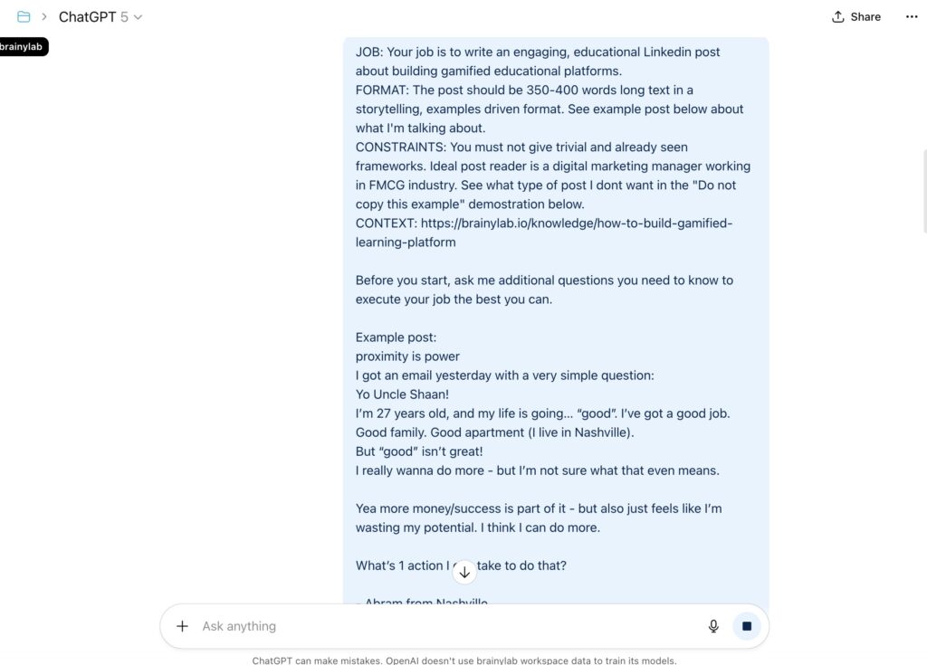 Sam ga najpogosteje uporabljam v kombinaciji s pristopom številka 2, absolutno pa izboljša tudi povsem običajno navodilo kot je “Napiši mi Linkedin objavo za …”.