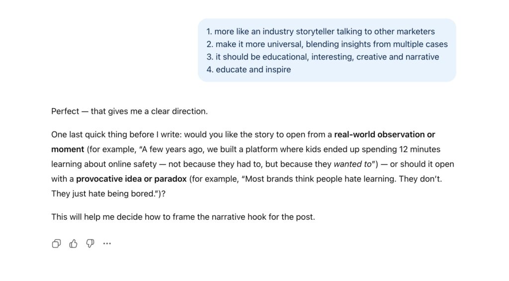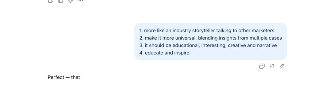 S tem narediš dve stvari hkrati. Model postane tvoj sogovornik, ne zgolj splošni izvajalec. Ti pa dobiš precej boljše rezultate in bolje razumeš kako te model sploh razume.