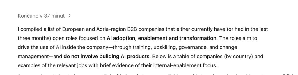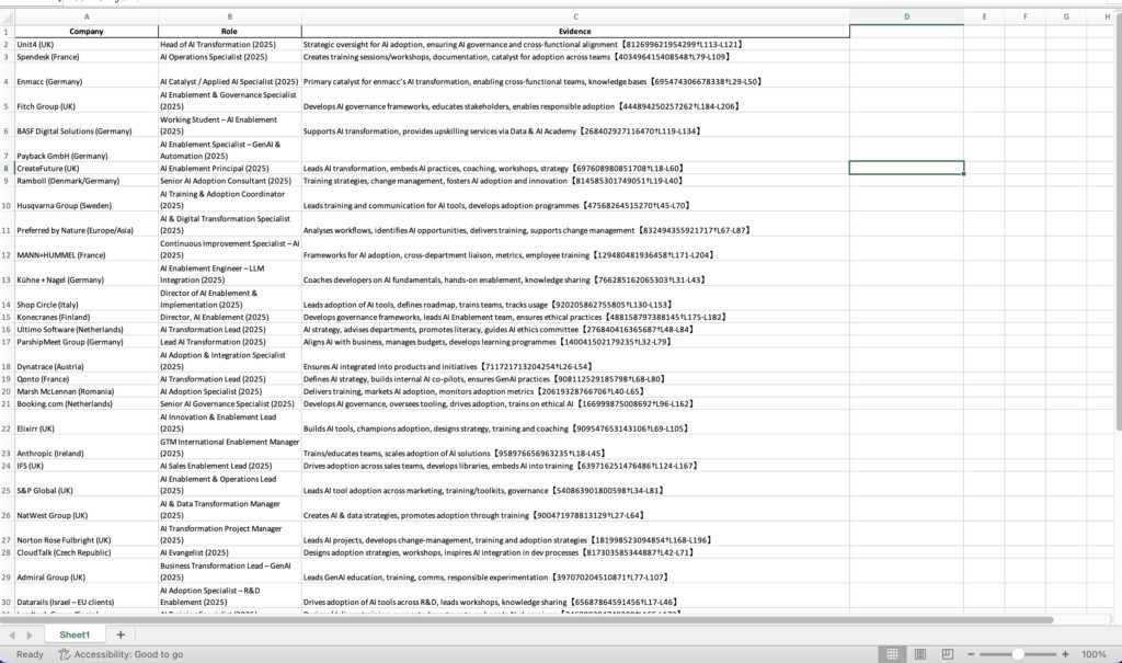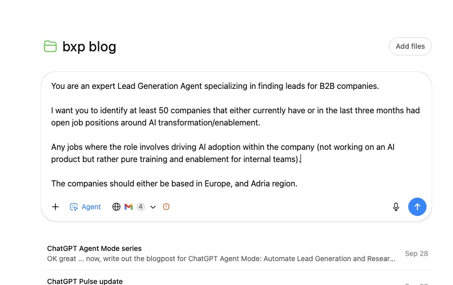 Example: If you sell AI workshops and content, your agent could search for companies hiring “AI transformation” or “AI enablement” roles in the U.S. or Europe.