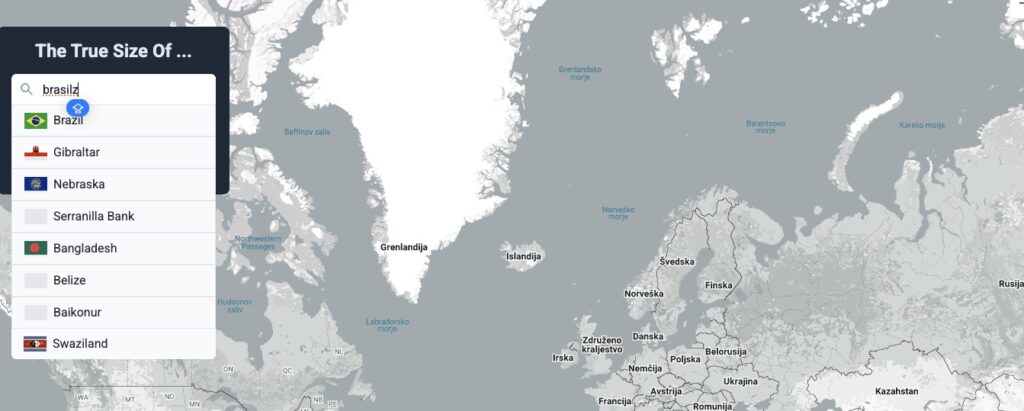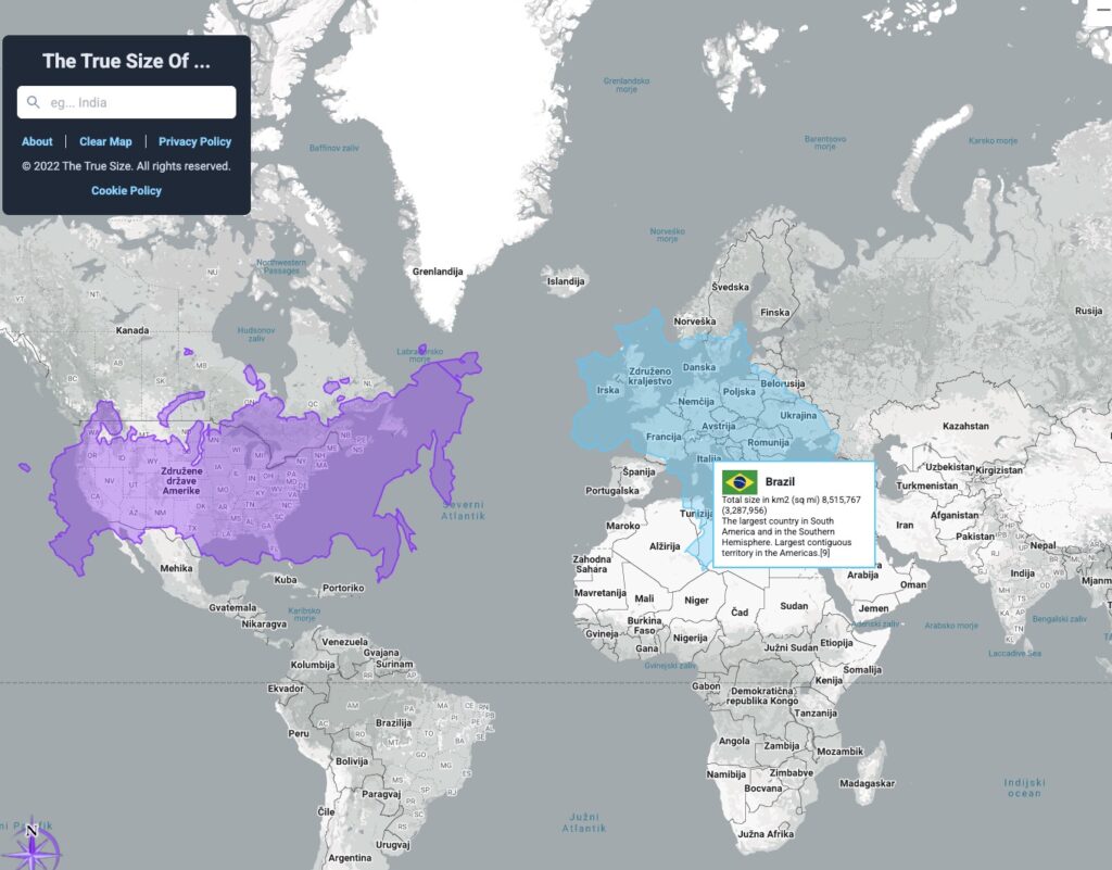 The country colors and you can drag it around to see how big it is compared to other parts of the world.